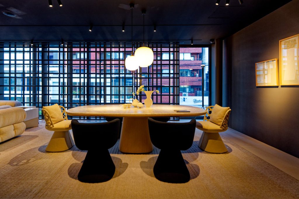 1階奥は階段でフロアがステージのように上がっており、細長いフレームワークで座面や天面を支えキリッと見せる、いかにもイタリアらしい印象の逸品が映える。