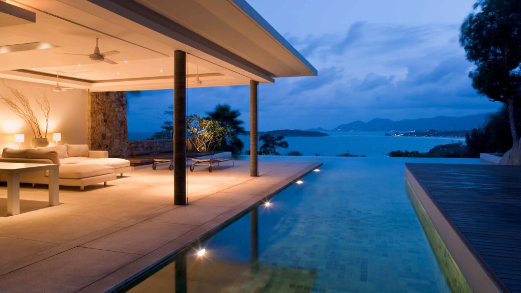 外構照明は演出装置であると同時に、電気設備でもある。また、プールまわりのBGM機器は、屋外環境にさらされる。パーティールームのホームシアターは、別荘では長期間未使用となる可能性がある。