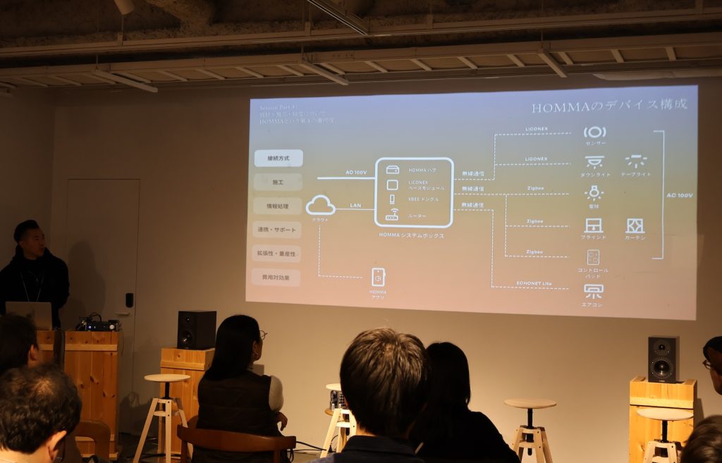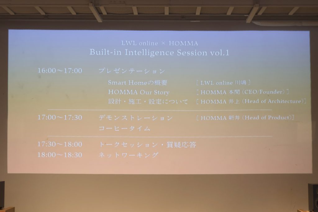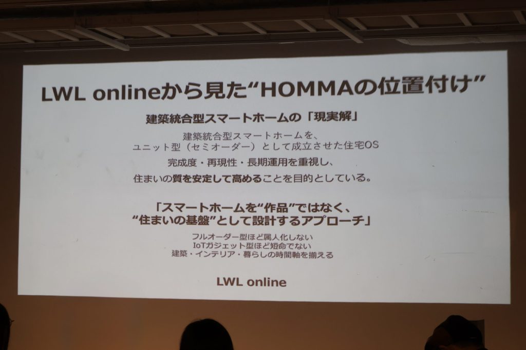 本イベントは、HOMMAとLWL onlineの共同運営により開催されたもの。会場となったのは、HOMMAの代々木上原オフィスだ。セッションでは、照明・空調・遮光・セキュリティといった住空間の要素を、設備単位ではなく「建築段階から統合するOS」として捉えるHOMMA Home OS構想が紹介された。