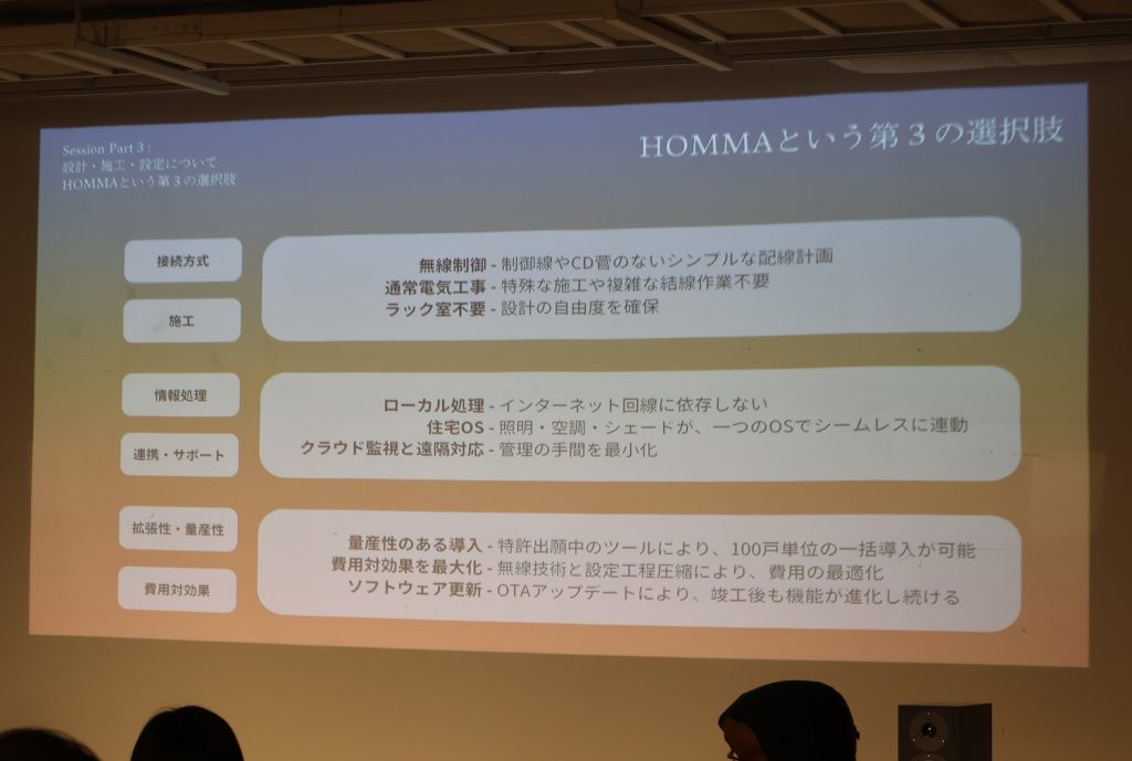 後半では、HOMMAで建築部門を担う井上亮氏が、より具体的なプロセスについて解説した。HOMMAのHome OSは、レガシーシステムの統合性と、IoTの手軽さを併せ持つ「第3の選択肢」として位置づけられる。接続方式、施工手順、情報処理、サポート体制、拡張性、費用対効果といった観点から、上述の通りレガシーとIoTの“良いとこ取り”を実現している点がアピールされた。