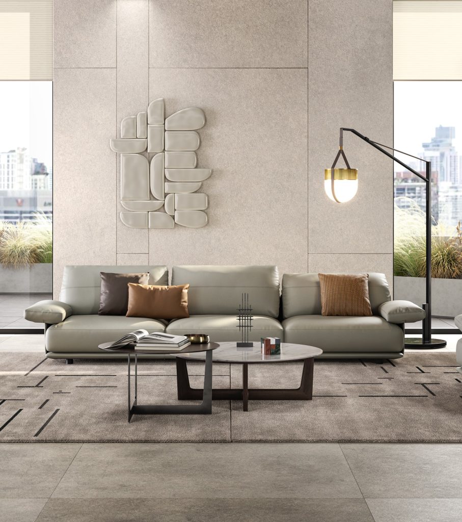 モジュール構成によってレイアウトは自在。広いリビングの中心にも、落ち着いたラウンジ空間にも調和し、空間の中心に穏やかな重力を生む家具といえるだろう。