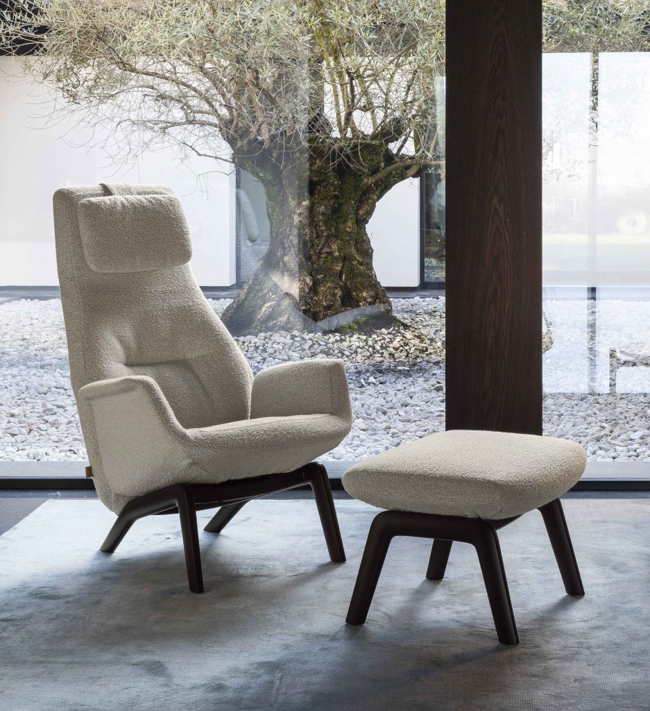 同シリーズにはオットマンも用意されており、同じ素材と仕上げで統一することで、より完成度の高いラウンジ空間を構成することができる。脚をゆったりと伸ばしながら過ごす時間は、日常の中に小さな贅沢をもたらすだろう。