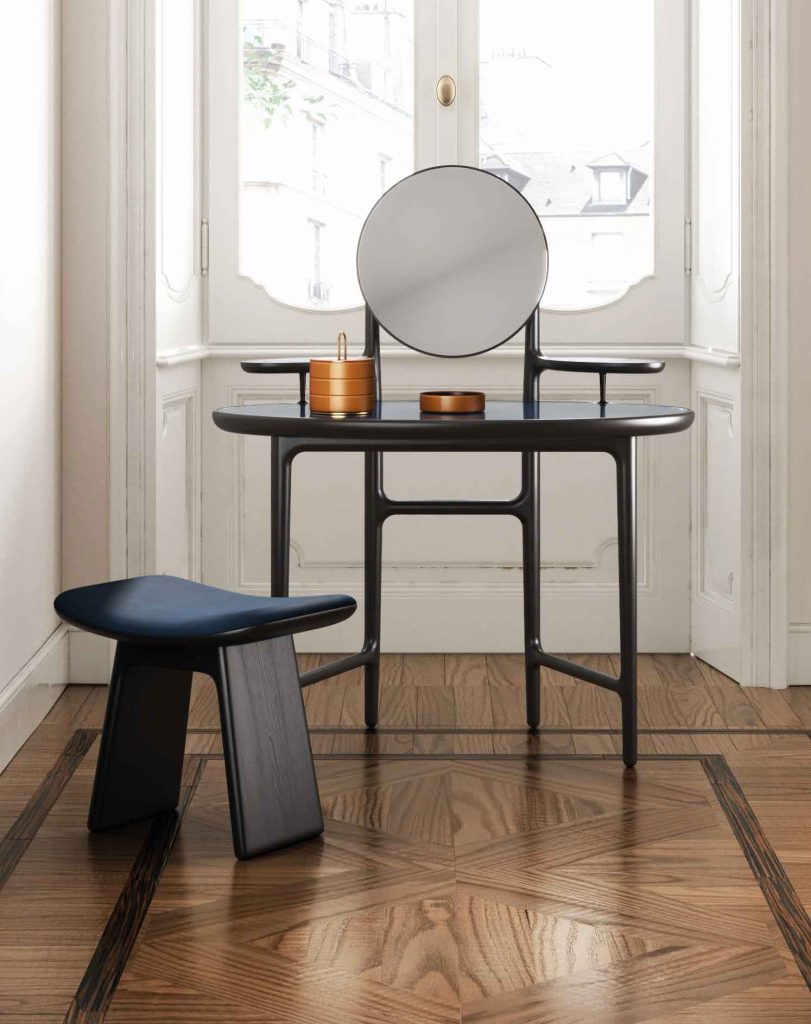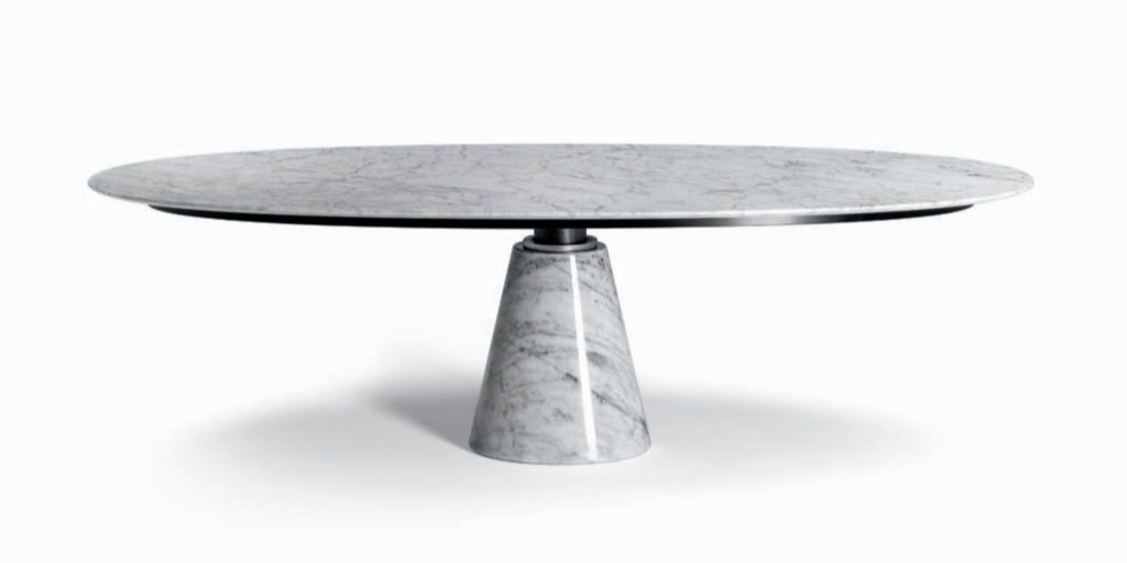 繊細な大理石の天板と力強い円柱ベースのコントラストは、装飾に頼らず素材そのものの美しさを際立たせる。こうした潔い造形は、ポルトローナ・フラウの家具が単なる装飾品ではなく、建築空間と対話する存在であることを示している。