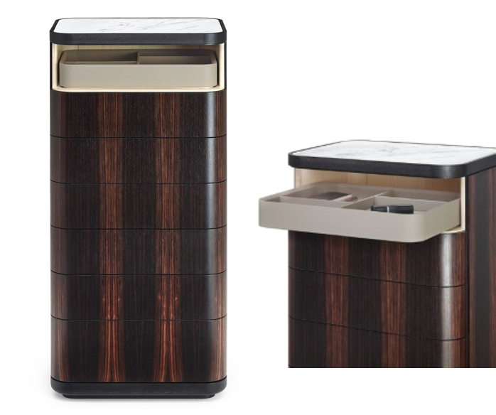 寝室やプライベート空間を彩るのが、デザイナーロベルト・ラッツェローニによる「DUOコレクション」だ。このシリーズは、高級家具ブランド「チェコッティ・コレツィオーニ」との協働により誕生したもの。丸みを帯びた柔らかなフォルムと上質な素材が、どこか懐かしさを感じさせるレトロモダンな雰囲気を醸し出す。