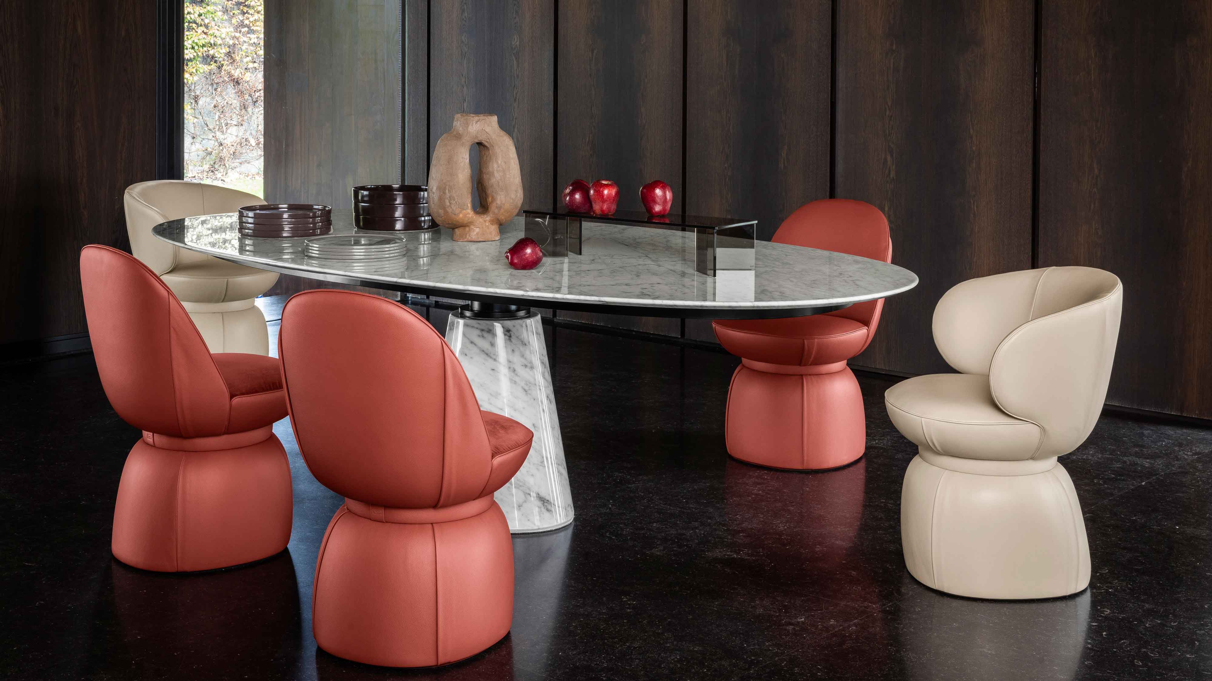 繊細な大理石の天板と力強い円柱ベースのコントラストは、装飾に頼らず素材そのものの美しさを際立たせる。こうした潔い造形は、ポルトローナ・フラウの家具が単なる装飾品ではなく、建築空間と対話する存在であることを示している。