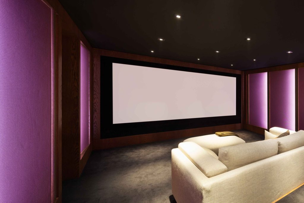 映画を家庭で再現するためには、「映像」「音響」「照明」「遮光(シェードやブラインド)」「空調」を同時に制御する必要があった。例えば「CINEMA START」という操作ひとつで、「照明が徐々に暗くなる」→「シェード、ブラインドが閉じる」→「プロジェクターが起動する」→「AVシステムが連動する」→「空調が静音モードになる」といった一連の動作が実行される。
