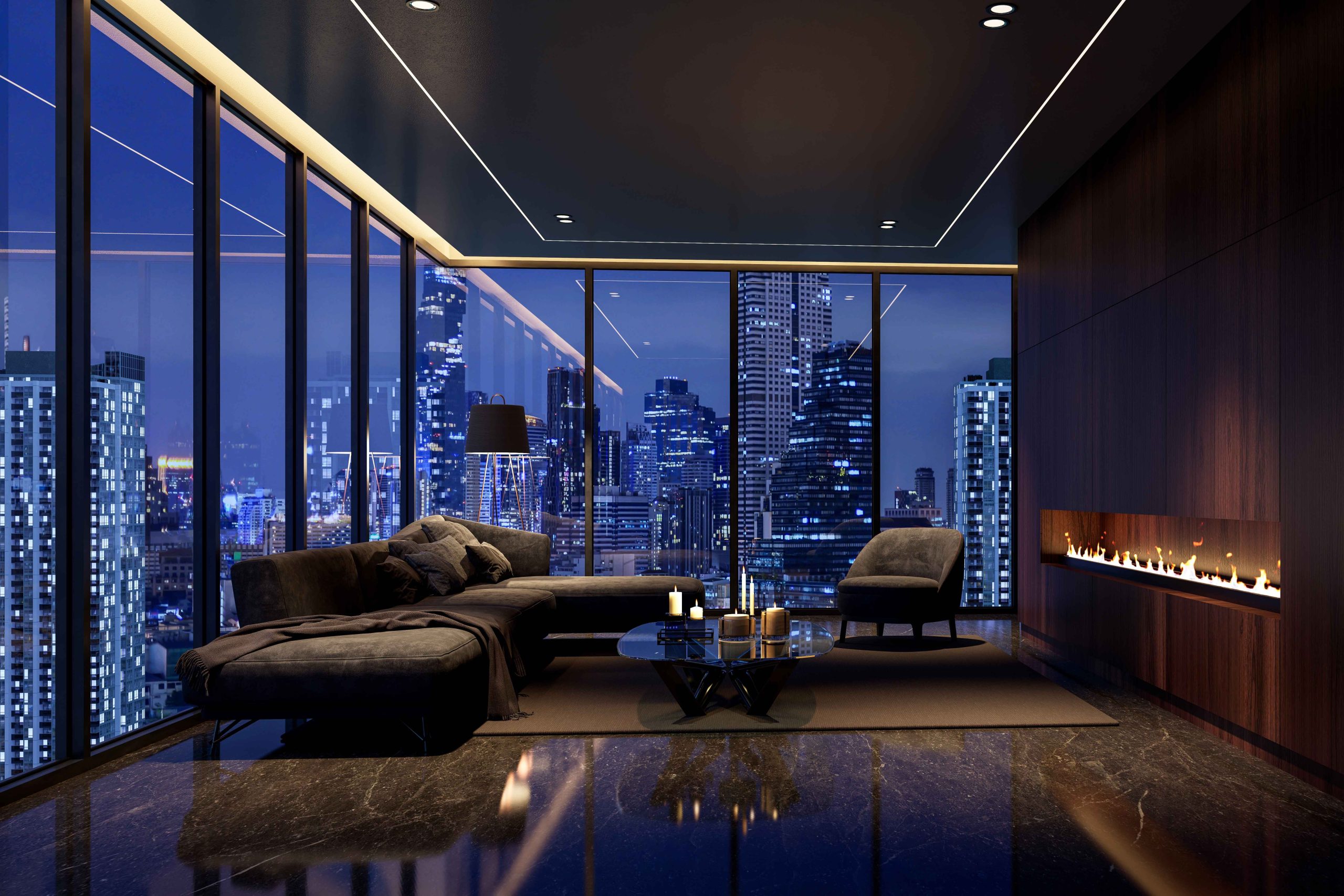 Luxury living room at night with city skyline views through floor-to-ceiling windows