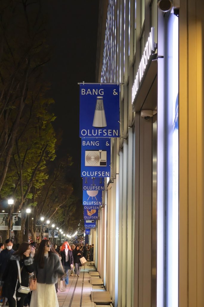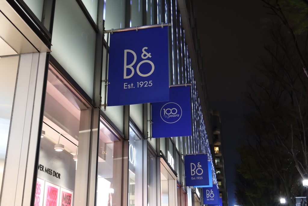 「表参道ヒルズ20周年スペシャルパーティー with Bang & Olufsen」が開催されたその日、ケヤキ並木に沿ってハウス オブ ディオール ビューティーやハリー・ウィンストン、タグ・ホイヤーなどが並ぶ表参道ヒルズの外壁は、バング&オルフセンのクラフトマンシップを象徴するフラッグで彩られていた。