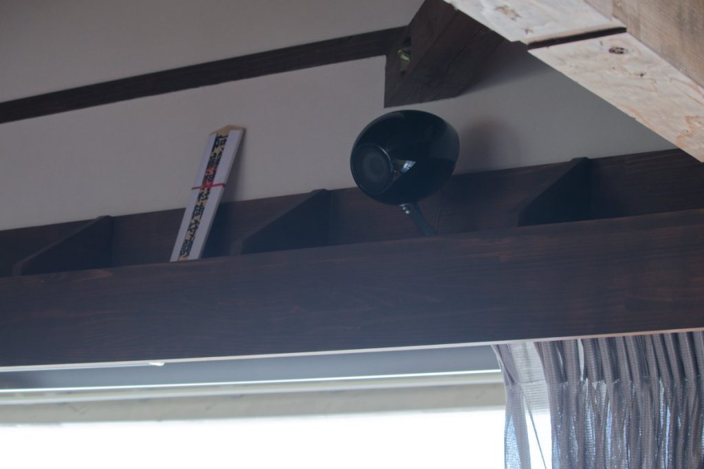 ダイナミックスカスタマイズがインストールしたホームシアターは、1階のリビングに設置されていた。動線を妨げないようにスピーカーは壁掛けし、プロジェクターは室内奥から軒に向かって投写する仕組み。使うときだけ電動のスクリーンが降りてきて映像を投写する。