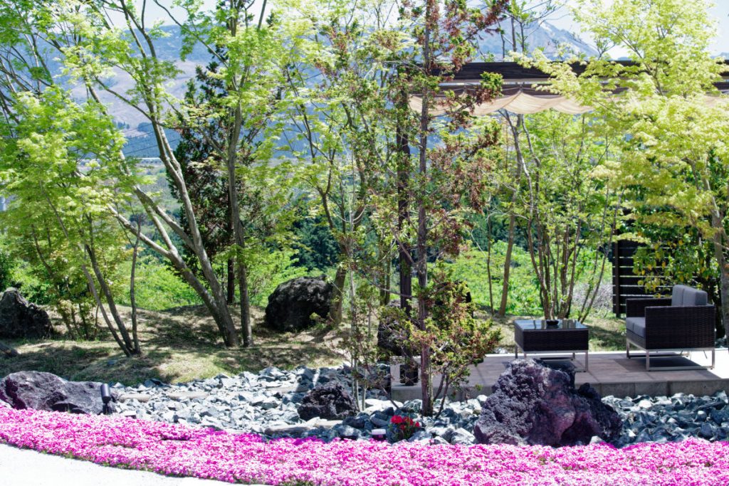 芝桜が満開の美しい庭の先は崖になっており、米塚を中心とした阿蘇の山々が広がる。豊かな自然に包まれたこの場所は、まさしく天空のリゾート。訪れたのは25年4月末だが、秋には紅葉も愉しめるという。最高のリゾート日和で、取材なのを忘れてしばし佇む。