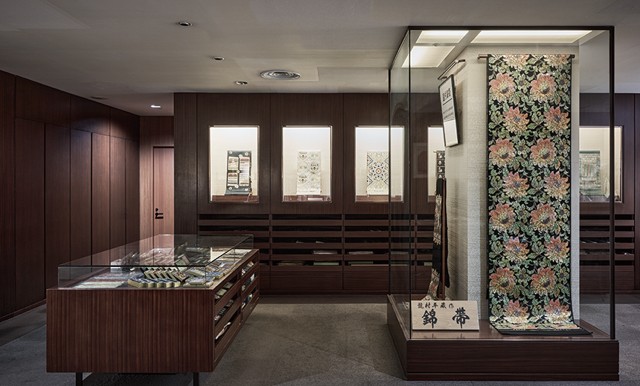 織物を主役に据えながら、それを支える家具の構造や重厚感、ディテールをどう成立させるか。そこでは、単に伝統意匠を貼り付けるのではなく、美術織物の品格を損なわずに空間として成立させる設計力が問われる。