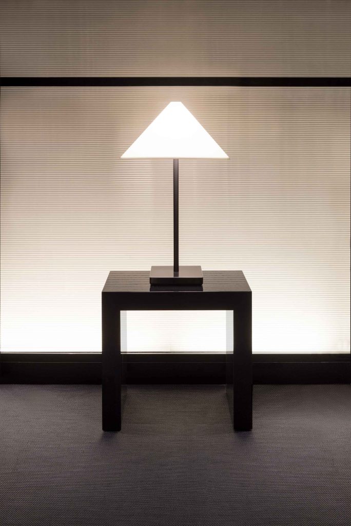 本インスタレーションの中心に据えられるのが、1982年にジョルジオ・アルマーニ自身が手がけたテーブルランプ「Logo Lamp(ロゴ ランプ)」である。