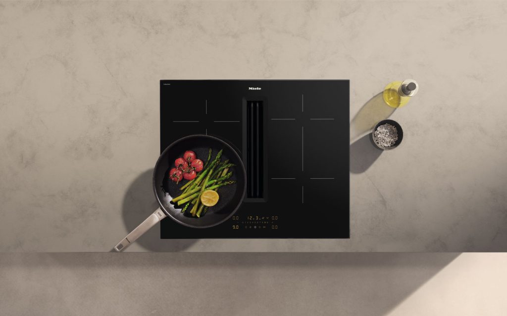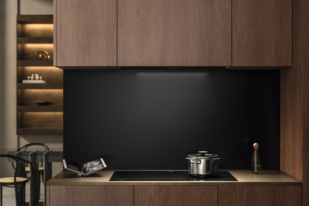 換気設計においても、ミーレは建築との親和性を強く意識している。60cm幅のコンパクトなクッキングヒーター一体型換気システムや、キャビネット内にほぼ見えないかたちで収まるガラスパネルフードは、視界を妨げず、空間を守りながら、高い機能性を両立する。キッチンにおける設備の存在感を抑えつつ、必要なときだけ機能が立ち現れるというあり方は、これからのラグジュアリー空間において、ますます重要になっていくだろう。