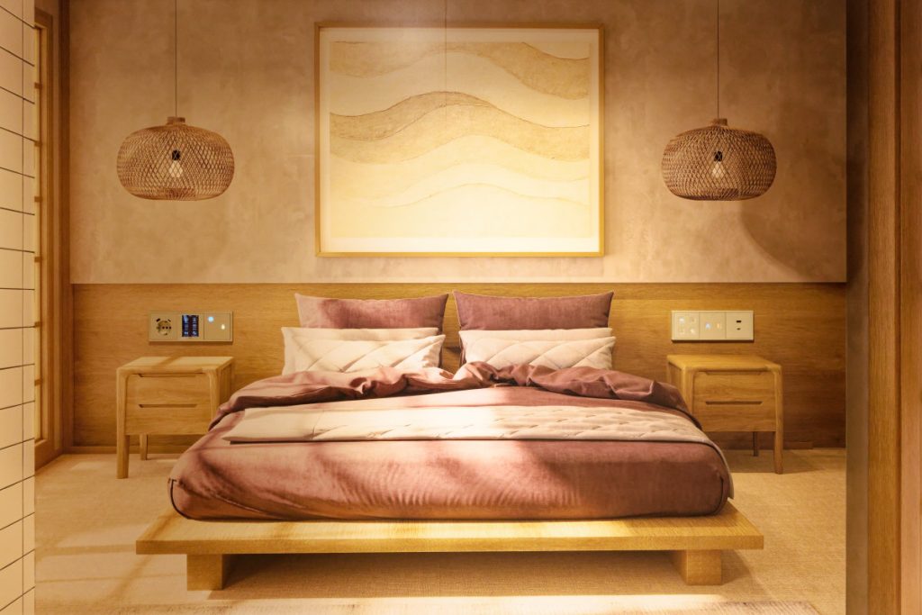 ホテルをイメージしたベッド周りには、照明、エアコンなどがすべて一箇所のスイッチパネルに収まり、一括操作できる
