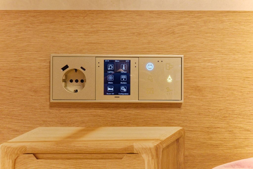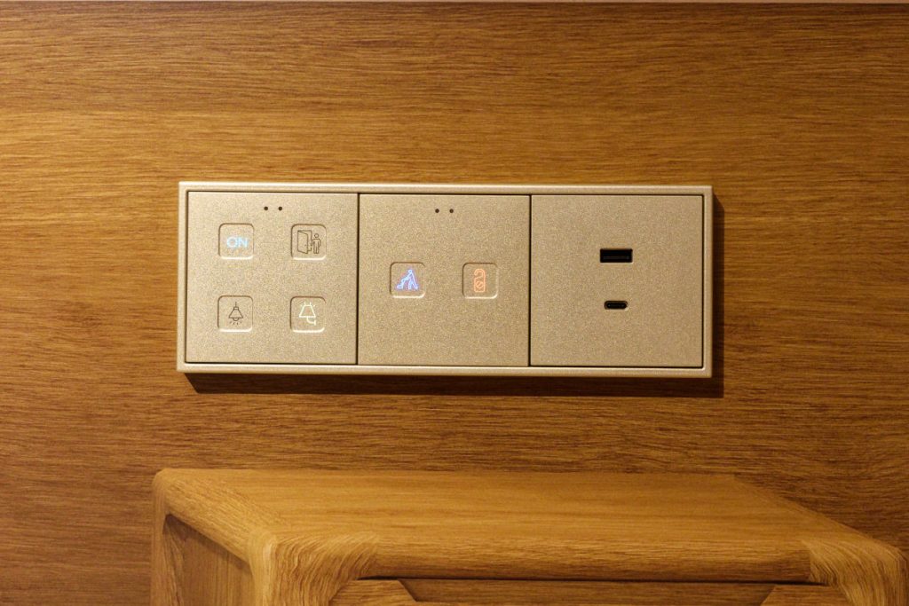 日本で一般的な、宿泊者がカードホルダーにカードキーを入れてはじめて部屋の機器が動作するとか、ドアノブに入室中の札を掛けるといったことも不要だ。入室してすぐに電気が点いてカーテンが動作するのは当たり前というのは、とても快適。ゲストに合わせた言語対応や、老若男女誰でも分かるピクトグラムスイッチ、IPTVの画面にウェルカムメッセージが出るなど、また泊まりたくなるホテルになること請け合いである。