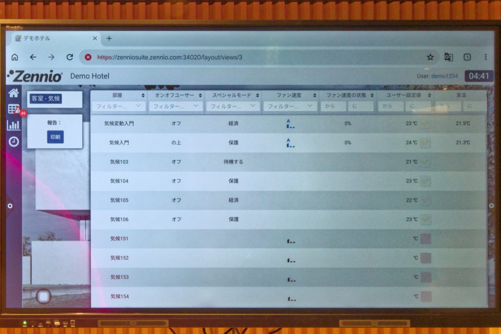 ホテル側が顧客のチェックイン&チェックアウトの情報を共有していれば、それに合わせ各部屋の室温制御ができる。例えば、103号室の宿泊客が、4月10日の15時にチェックインするのならば、13時頃からゆっくり温度上げて省エネしつつ制御。チェックアウト後は清掃のために最適な温度にするといったこともプログラムできる。